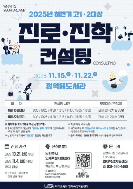 [뉴스노크=김인호 기자] 남양주시는 오는 21일부터 ‘2025년 하반기 진로·진학 컨설팅’참가자를 모집한다고 밝혔다.