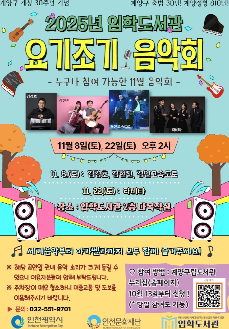 자세한 공연 안내 및 신청은 계양구립도서관 누리집을 참고하거나 임학도서관 종합자료실로 문의하면 된다.