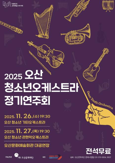 [뉴스노크=김인호 기자] 오산문화재단이 주최하고 오산시가 후원하는 ‘2025 오산 청소년 오케스트라 정기연주회’가 오는 11월 26일부터 27일까지 오산문화예술회관 대공연장에서 이틀간 개최된다. 공연은 전석 무료로 시민 누구나 관람할 수 있다.