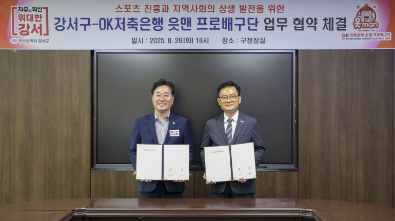 [뉴스노크=김인호 기자] 부산 강서구와 OK저축은행 읏맨 프로배구단(단장 권철근)은 8월 26일 오후 4시 강서구청 구청장실에서 ‘스포츠 진흥과 지역사회의 상생 발전을 위한 상호 협력 협약’을 체결했다.