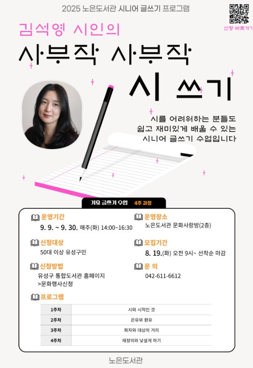 [뉴스노크=김인호 기자] 대전 유성구는 9월 독서의 달을 맞아 노은도서관에서 시니어를 위한 글쓰기 프로그램 ‘김석영 시인의 사부작 사부작 시 쓰기’를 운영한다.