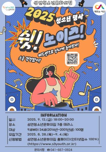 [뉴스노크=김인호 기자] 성연청소년문화의집은 오는 28일 서산시 청소년을 대상으로 2025년 청소년 무소음 행사 '쉿! 노이즈' 참가자를 모집한다고 밝혔다.