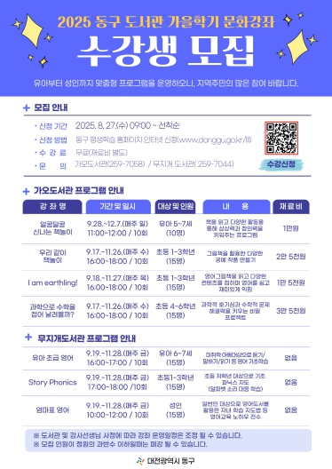 [뉴스노크=김인호 기자] 대전 동구는 다음 달부터 12월까지 운영되는 ‘2025년 도서관 가을학기 문화강좌’ 수강생을 모집한다고 27일 밝혔다.