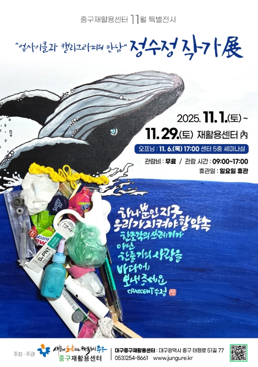 [뉴스노크=김인호 기자] 대구 중구는 11월 1일부터 11월 29일까지 중구재활용센터에서 ‘업사이클과 캘리그라피의 만남’을 주제로 한 정수정 작가 초대전을 개최한다.