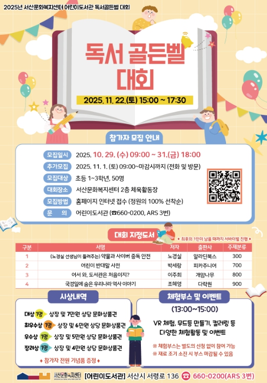[뉴스노크=김인호 기자] 서산문화복지센터 어린이도서관은 책 읽는 문화 확산을 위해 2025년 독서골든벨 대회를 11월 22일 초등 1∼3학년 50명을 대상으로 서산문화복지센터 체육활동장에서 진행할 예정이다.