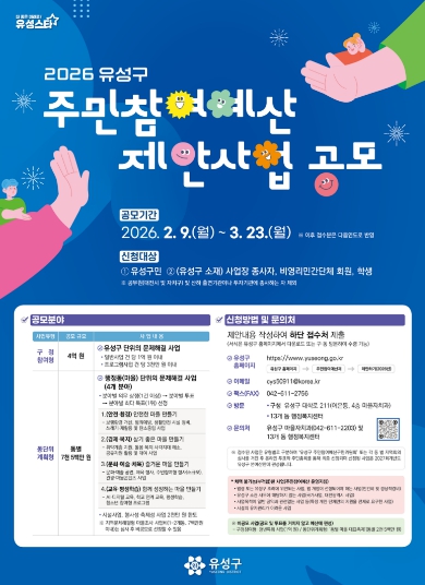 [뉴스노크=김인호 기자] 대전 유성구는 2월 9일부터 3월 23일까지 2027년도 예산 편성을 위한 ‘주민참여예산 주민제안사업’ 공모를 진행한다.