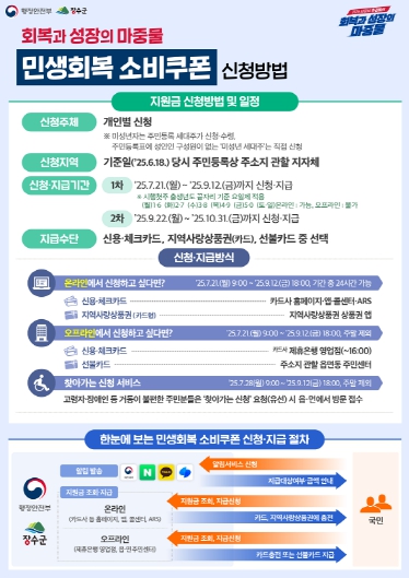 [뉴스노크=김인호 기자] 장수군은 오는 21일부터 전 군민에게 소비 진작과 소상공인 매출 확대를 위한 민생경제 회복 정책으로 민생회복 소비쿠폰을 지급한다고 밝혔다.