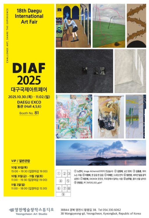 [뉴스노크=김인호 기자] 영천예술창작스튜디오는 30일 프리뷰를 시작으로 11월 2일까지 4일간, 대구 엑스코 동관(홀 4·5·6)에서 열리는 ‘대구국제아트페어 2025(DIAF 2025)’에 17기 입주작가 9명의 작품 29점을 출품한다.