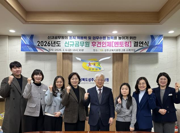 [뉴스노크=김인호 기자] 경상북도성주교육지원청은 6일 소회의실에서 2026. 1. 1.자 신규 공무원 1명, 멘토 공무원 2명이 참석하여 신규 공무원의 조직 적응력을 높이고 자신감 있는 공직 생활을 유도하고자 후견인제(멘토링) 결연식과 직무연수를 가졌다.