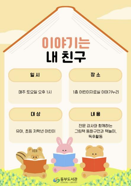 이번 프로그램은 유아 및 어린이를 대상으로 매주 토요일 오후 1시 동부도서관 어린이자료실에서 운영된다. 단순한 책 읽기를 넘어, 강사의 실감 나는 동화구연과 아이들의 눈높이에 맞춘 다채로운 책놀이 독후활동을 함께 진행하여 독서의 즐거움을 더할 예정이다.