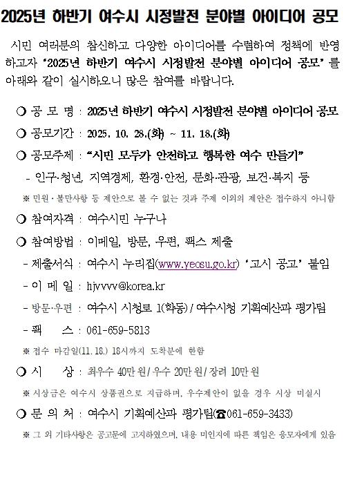 | ▲ ‘2025년 하반기 여수시 시정발전 분야별 아이디어 공모’ 공고문 |