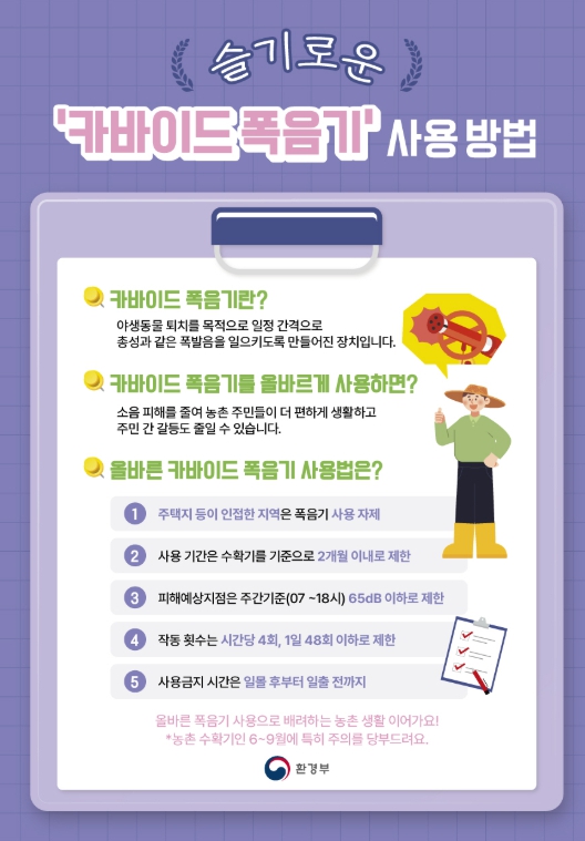 폭음기는 △주택가 인접 지역 사용 자제 △수확기를 기준으로 사용 기간 2개월 이내 제한 △작동 횟수 시간당 4회(1일 48회 이하) 등이 권고된다.