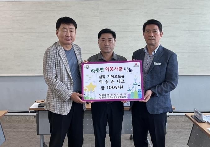 [뉴스노크=김인호 기자] 전라남도 나주시 남평읍은 최근 남평 기아오토큐 이승준 대표가 남평읍 지역사회보장협의체에 이웃사랑 후원금 100만 원을 전달했다고 26일 밝혔다.