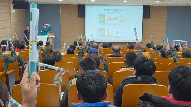 | ▲ 밀양시가 입국한 라오스 외국인 계절근로자들을 대상으로 생활 안내 사항 교육을 진행하고 있다. |