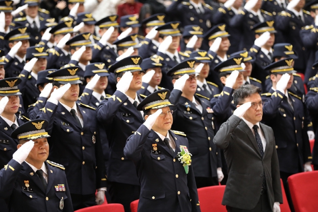 | ▲ 신임경찰 졸업식에 앞서 국기에 대한 경례를 하는 해양경찰청장 직무대행 장인식 치안정감 |