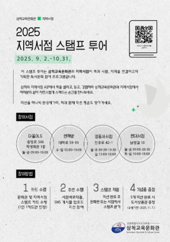 특히 9월 2일부터 10월 31일까지 운영되는 ‘지역서점 스탬프 투어’는 교육문화관과 지역서점에서 희망도서 서점 바로대출 서비스 이용, 누리 소통망(SNS) 게시물 업로드 등 총 5가지 미션을 수행하면 스탬프를 적립해 기념품을 받을 수 있는 참여형 프로그램이다.