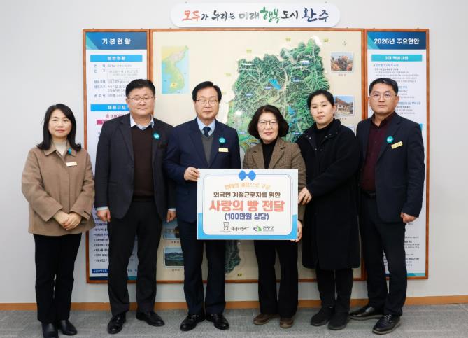 군은 지난 13일 군수실에서 ‘사랑의 빵’ 전달식을 열고, 고향을 떠나 완주 농가에 힘을 보태고 있는 근로자들을 위로하며 따뜻한 정을 건넸다.