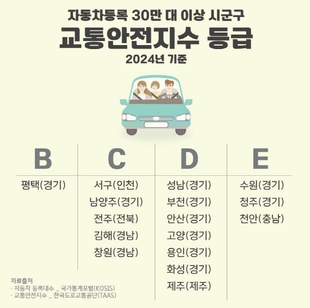 평택시 교통안전지수 등급은 30만 대 이상 자동차가 등록된 전국 시군구 중 가장 높은 것으로 나타났다. 자동차등록 30만 대 이상 시군구는 총 16개로, 평택시를 제외한 15개 시군구는 C~E등급에 머물렀다.