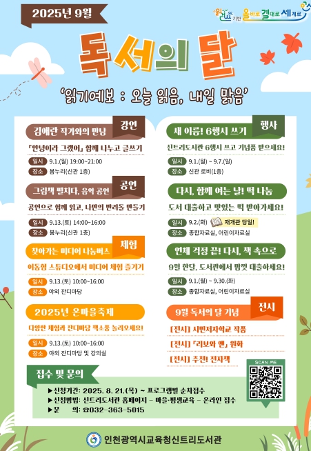 [뉴스노크=김인호 기자] 인천광역시교육청신트리도서관은 9월 한 달 동안 ‘읽기예보: 오늘 읽음, 내일 맑음’을 주제로 인천시민을 위한 다양한 독서문화 행사를 운영한다.