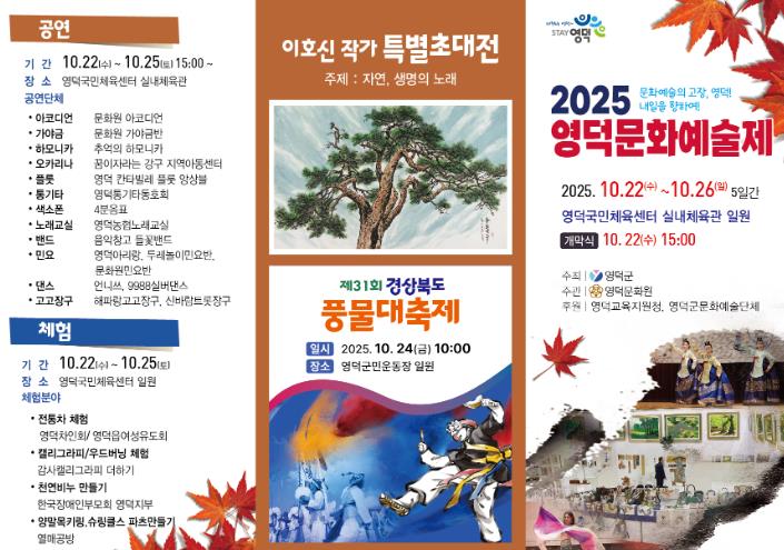 김두기 문화원장은 “올해는 군 내외의 많은 문화예술인이 참여해 예년보다 더욱 풍성한 문화예술제가 될 것”이라며, “특히 영덕 출신으로 ‘생활산수화’라는 새로운 장르를 개척하고 2017년 대통령상(문화포장)을 수상한 이호신 작가 특별초대전을 통해 군민들의 예술 감수성을 높이고자 한다.”고 밝혔다.