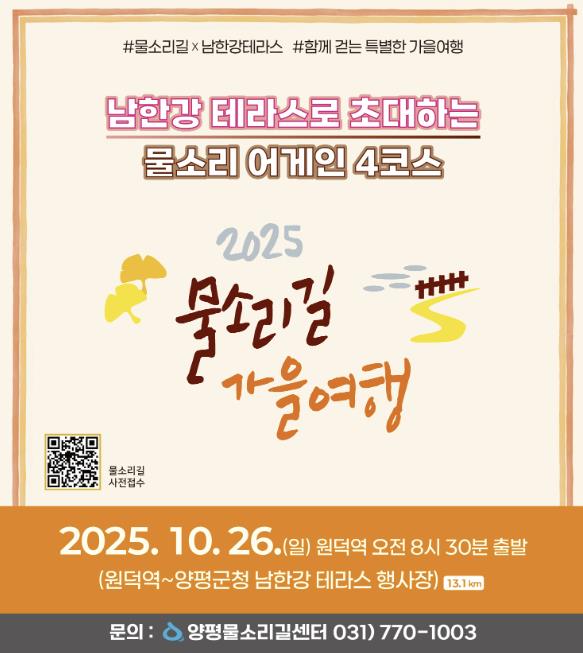 전진선 양평군수는 “물소리길 가을여행은 매년 많은 도보 여행객들이 찾는 대표 걷기 축제로, 올해는 남한강테라스 행사와 함께 더욱 풍성한 프로그램으로 준비했다”며, “양평의 아름다운 가을을 함께 걸으며 즐기시길 바란다”고 전했다.