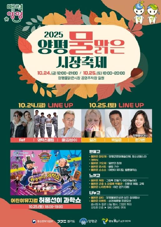 [뉴스노크=김인호 기자] 양평물맑은시장의 대표 축제인 ‘2025 양평물맑은시장 축제’가 오는 10월 24일부터 25일까지 양평물맑은시장 공영주차장에서 열린다.