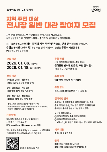 대관 유형은 일반 대관(전시형)으로 2026년 2월 28일부터 4월 26일까지 문화공장 방어진 내 전시장 ‘스페이스 중진2.5’에서 진행된다. 전시 공간이 필요한 지역 주민 및 동호회는 비영리 목적으로 참여할 수 있으며, 신청자가 3개 팀을 초과할 경우, 울산 동구 주민을 우선 선정 후, 잔여 팀에 대해 추첨을 통해 갤러리 공간을 지원한다.