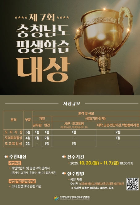 [뉴스노크=김인호 기자] 충남평생교육인재육성진흥원은‘2025년 제7회 충남 평생학습대상’표창 공모를 실시한다고 23일 밝혔다.