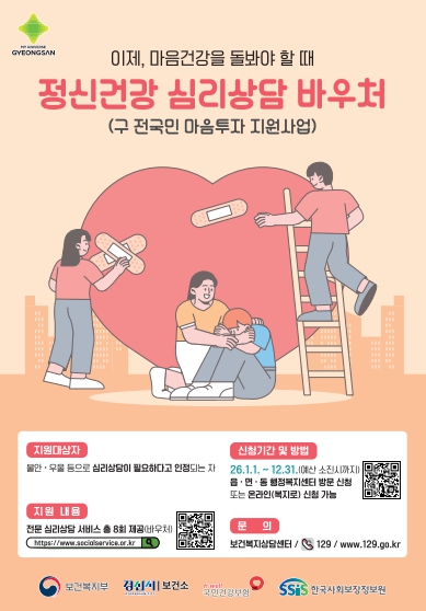 [뉴스노크=김인호 기자] 경산시는 우울, 불안 등 정서적 어려움이 있는 시민에게 대화 기반의 전문심리상담 서비스를 제공하는 '정신건강 심리상담 바우처사업'을 시행한다.