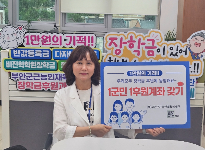 대학교 전 학년 전 학기 연간 2200여명의 학생들에게 약 20억원의 장학금을 지급해 온 부안군이 장학금 수혜자인 군민들이 후원의 주체가 되는 장기적으로 안정적이고 건전한 재단 운영기반을 마련하고자 장학금 1군민 1후원계좌 갖기 운동에 박차를 가하고 있다.
