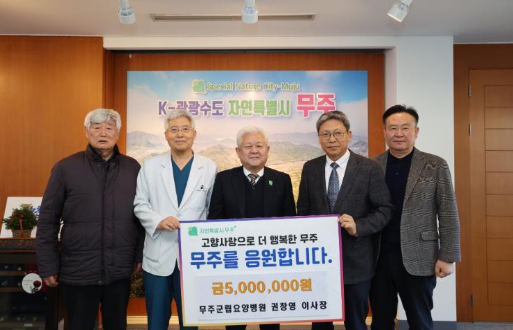 [뉴스노크=김인호 기자] 무주군으로부터 무주군립요양병원을 위탁받아 운영하는 (사)소산 권창영 이사장이 고향사랑기부금 5백만 원을 기탁했다. 이날 기탁식에는 권도훈 무주군립요양병원장과 임원진 등 4명이 함께 해 의미를 더했다.