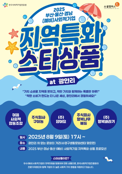 8월 9일 오후 5시부터 진행되는 광안리 ‘차 없는 문화의 거리’ 행사에서 부산·울산·경남 지역특화 스타상품 5개 기업이 특별전시 부스를 차리고 관광객들을 맞이한다. 이날 기업들은 폐자원을 새활용한 패션소품, 지역특산물로 만든 수제청, 발달장애인 자립 지원에 이윤이 돌아가는 우리밀 쿠키 등 지역의 우수상품을 판매한다.