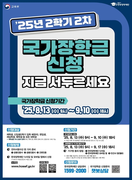 [뉴스노크=김인호 기자] 교육부와 한국장학재단은 8월 13일 9시부터 9월 10일 18시까지 ‘2025학년도 2학기 2차 국가장학금 통합 신청’을 받는다고 밝혔다.