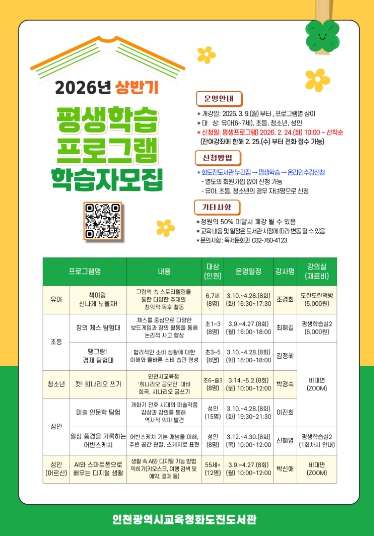 [뉴스노크=김인호 기자] 인천광역시교육청화도진도서관은 시민의 다양한 학습 수요를 충족하기 위하여, 오는 24일부터 ‘2026년 상반기 평생학습프로그램’학습자를 모집한다.