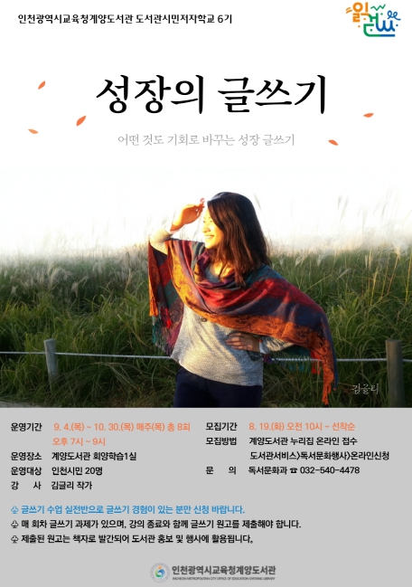 [뉴스노크=김인호 기자] 인천광역시교육청계양도서관은 9월 4일부터 10월 30일까지 매주 목요일 오후 7시부터 9시까지 김글리 작가와 함께하는 ‘성장의 글쓰기’ 강좌를 운영한다.