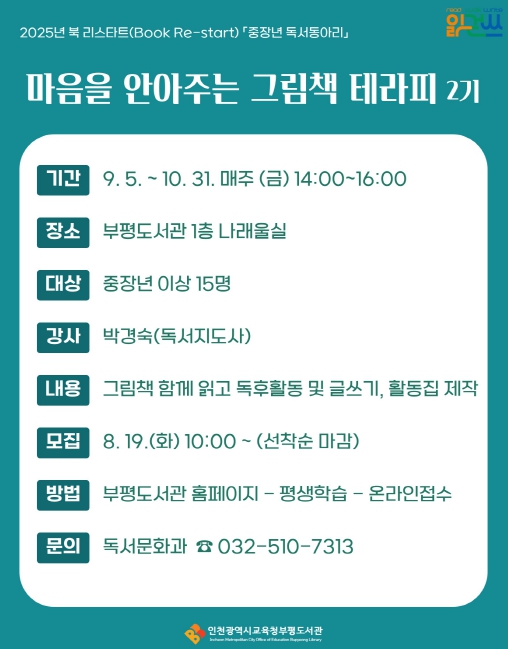 [뉴스노크=김인호 기자] 인천광역시교육청부평도서관은 중장년과 노년층을 대상으로 하는 ‘북 리스타트’ 독서동아리 하반기 참여자를 모집한다.