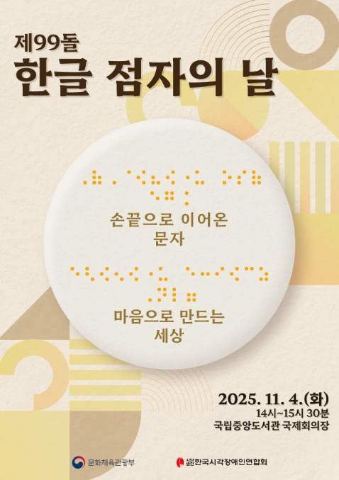 [뉴스노크=김인호 기자] 문화체육관광부는 한국시각장애인연합회와 함께 11월 4일 오후 2시, 국립중앙도서관에서 ‘제99돌 한글 점자의 날’ 기념식을 개최한다.