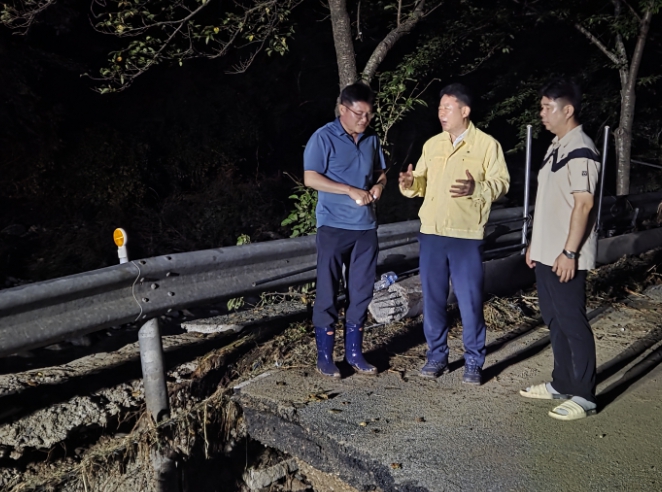 서태원 군수는 이날 밤 10시경 최원중 가평군의회 의원과 함께 복구 현장을 찾아 피해 상황을 점검하고 공사 관계자들을 격려했다.