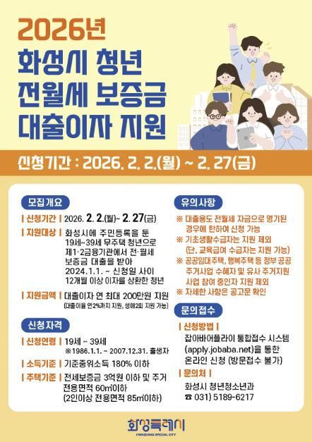 정명근 화성특례시장은 “주거비는 청년들이 겪는 주요 부담 중 하나인 만큼, 주거 안정은 생활 전반의 안정으로 이어질 수 있다”며 “대상 요건에 해당하는 청년들이 제도를 확인하고 활용하길 바란다”고 말했다.