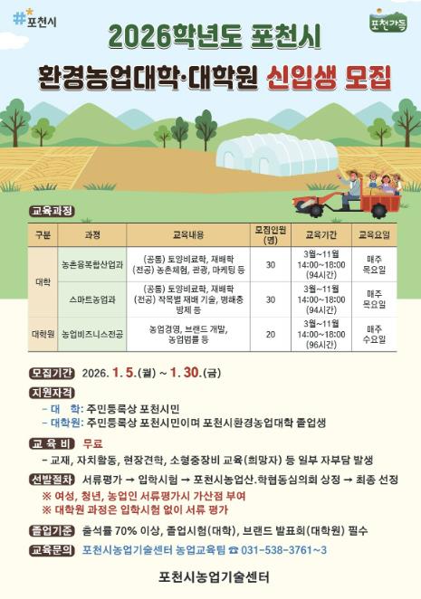 [뉴스노크=김인호 기자] 포천시는 2026년 1월 5일부터 30일까지 ‘2026학년도 포천시 환경농업대학 및 대학원’ 신입생을 모집한다.