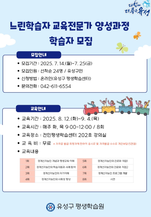이번 교육은 학습과 일상에서 어려움을 겪고 있는 느린학습자를 체계적으로 지원할 전문 인력을 양성하기 위해 마련됐으며, 8월 12일부터 9월 4일까지 매주 화·목요일 전민평생학습센터에서 무료로 진행된다.