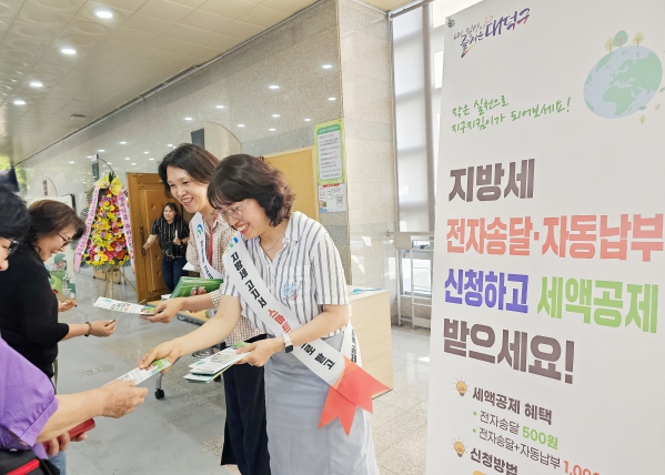 대덕구는 종이 고지서 제작 절감을 통한 탄소중립 실현을 위해 전자고지 신청을 적극 권장하고 있으며, 이날 홍보 리플릿 배부하고 모바일 앱을 통한 전자송달 신청 방법을 직접 안내하는 등 적극적으로 홍보에 나섰다.