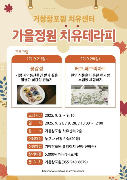 [뉴스노크=김인호 기자] 거창군은 거창창포원 내 치유센터에서 9월 한 달 동안 20여 명을 대상으로 지역 농산물과 자연 재료를 활용한 ‘가을정원 치유테라피 프로그램’을 운영한다고 밝혔다.
