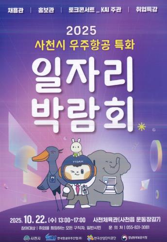 [뉴스노크=김인호 기자] 사천시는 오는 10월 22일 사천체육관에서 항공산업 중심의 청년 고용기회 확대를 위해 ‘2025년 사천시 우주항공특화 일자리박람회’를 개최한다.