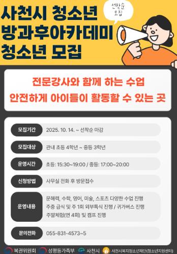 [뉴스노크=김인호 기자] 사천시 복지·청소년재단 소속 청소년방과후아카데미는 청소년의 안전한 방과 후 돌봄과 균형잡힌 성장을 지원하기 위해 신규 청소년을 모집한다고 15일 밝혔다.