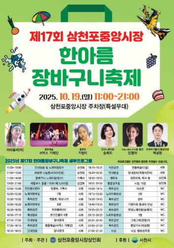 삼천포중앙시장 상인회가 주최하고, 사천시가 후원하는 이번 축제는 전통시장의 활성화와 지역경제 회복을 위해 마련된 자리로 오전 11시부터 오후 9시까지 다채로운 프로그램이 진행된다.