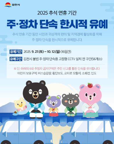 [뉴스노크=김인호 기자] 김천시는 9월 27일부터 10월 12일까지 16일간 추석 명절 기간 주정차 단속 카메라가 있는 전 구간(56개소)에 대하여, 단속 카메라를 통한 불법 주정차 단속을 유예한다.