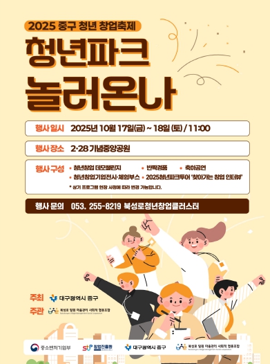 [뉴스노크=김인호 기자] 대구 중구는 청년창업가와 지역 주민이 함께 어울릴 수 있는 교류의 장을 마련하고자 2025년 중구 청년창업 축제 '청년파크 : 놀러온나'를 오는 10월 17일부터 18일까지 양일간 2·28기념중앙공원에서 개최한다고 밝혔다.