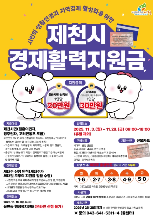 기준일(2025년 10월 10일)부터 신청일까지 제천시에 주소를 두고 있는 시민이라면 1인당 20만 원의 선불카드를 받을 수 있으며, 기초생활수급자, 차상위계층, 한부모가족 등 취약계층은 30만 원의 선불카드를 지급받을 수 있다.