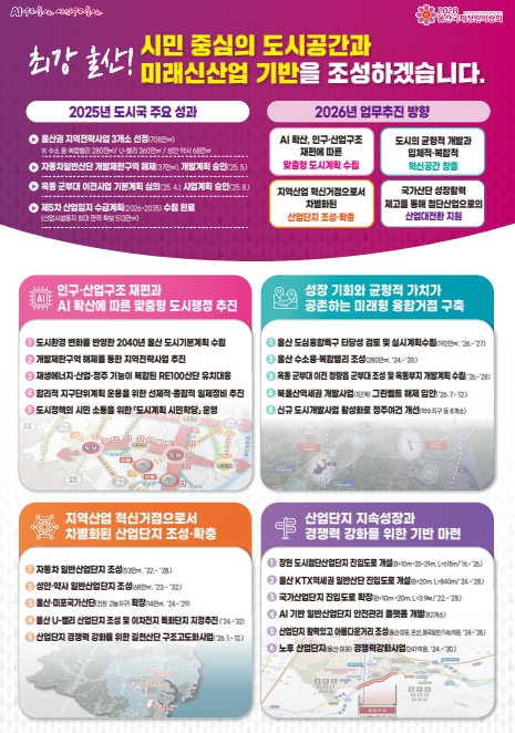 [뉴스노크=김인호 기자] 울산시가 ‘최강 울산!’ 완성을 위한 시민 중심의 도시공간 조성과 미래 신산업 기반 구축을 목표로 2026년 도시 분야 정책을 추진한다.